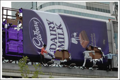 Aunque puede ser más costoso, un modelo gigante del producto puede despertar gran interés. Como esta barra gigante de chocolate.Utilizadas de manera creativa, las gigantografías puede lograr un altísimo impacto. En este caso se crea una ilusión óptica, donde las personas parecen pulgas sobre un perro.