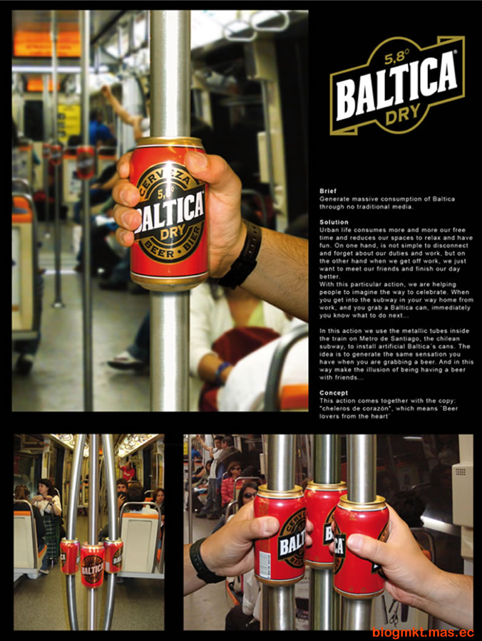 Este ejemplo de bebida nos muestra una manera creativa de hacer que el observador interactúe, sintiendo que tiene en sus manos el producto. Esta experiencia despierta el deseo de poseer, o en este caso, consumir el producto.