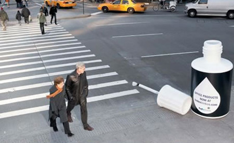 Finalmente esta publicidad de líquido corrector, nos da la ilusión de que la calle fue pintada con el producto. Esto refuerza la idea de uso del producto en la mente del observador.